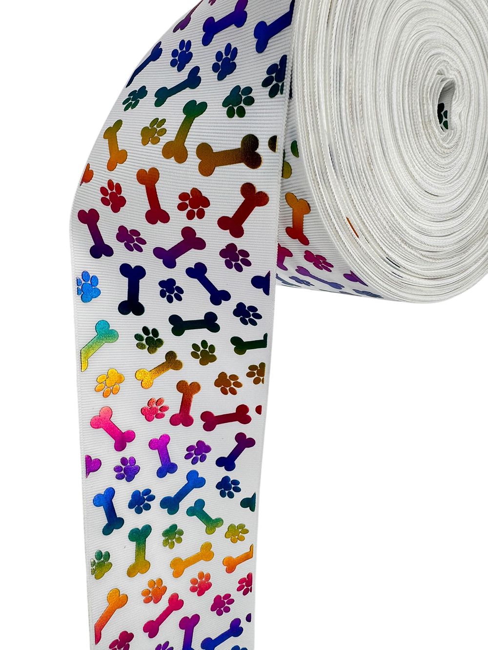 Liston blanco con huesitos y huellas en holograma de colores. Color podría variar a la imagen